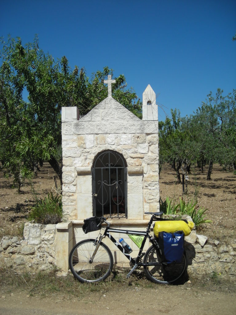 Brevemente e con grande sorpresa riusciamo a dileguarci nello scarso traffico del sabato mattina; arriviamo a Modugno in un batter d’occhio e ci concediamo una pausa pedalando nelle fresche viuzze del centro; ci dirigiamo poi verso Grumo Appula da dove parte il tratto in campagna verso Altamura grazie alla indicazioni di un carabiniere; km e km arsi dal sole in mezzo ad olivi a perdita d’occhio. Qualche contadino ci supera con il trattore e ci saluta; ogni tanto vedo in lontananza una auto sgangherata che ci viene in contro e mi vengono di nuovo i soliti dubbi; sarà una rapina? Quella poveraccia del TGR è stata bruciata in un campo come questo mi viene da pensare; cosa ci mettono poi a tirarti sotto in bici? chi vuoi che veda i segni di un incidente in vecchie 131 Mirafiori arrugginite, senza specchietti retrovisori che girano per queste campagne?